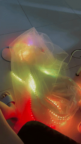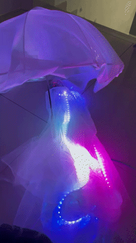 This week, I start to explore the materials to get the visual outcome of the jellyfish. At first, I'm afraid of using the exact white tentacles for the tentacles. Thus, I pick on one of the materials and explore around first before getting the actual material to work with. I have picked the fluorescent fabric for the tentacles since it shows a skeletal effect of the lights due to the refraction of lights on the fabric. I experiment with different lengths and sizes of the fabric on the tentacles.